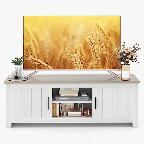 KOMFOTTEU TV-bord, lågbord för TV upp till 65 tum, TV-stativ med 2 skåp och 2 öppna hyllor, TV-skåp, TV-skåp för vardagsrum, matsal, sovrum (vit + grå)