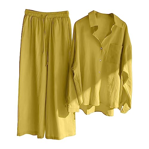 Tvådelad dräkt i ledig stil för damer, byxor och skjorta, bekväm outfit i retrostil, perfekt för vardag, plusstorlek, bomullstyg med knappar, hög midja, lös passform, fickor, byxdress, B-gul, L