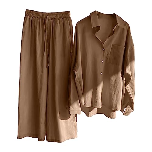 Tvådelad linne dam sommar byxor kostym rund hals ärmlös fritidsoverall med fickor bomull linne linne topp + hög midja vida ben byxor joggingdräkt 2 delar strand outfit set sommarkläder, A-kaki, XXL