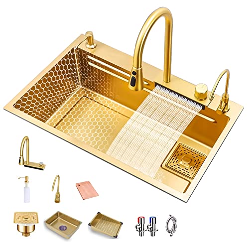 Guld Kök Diskbänk, Ny Rostfritt Stål Vattenfall Diskbänk, Bar Diskbänk, Workstation Bar Diskbänk Med Utdragbar Kran, Skärbräda, Tvål Dispenser (S : 75x46cm)