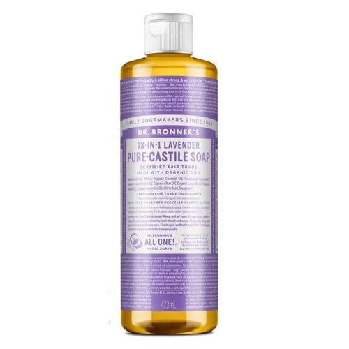 Dr Bronner's 18-i-1 lavendel ren kastil flytande tvål, tillverkad med ekologiska oljor, används för ansikte, kropp, hår, rätter, mopp och husdjur, certifierad rättvis handel och veganvänlig, 473 ml