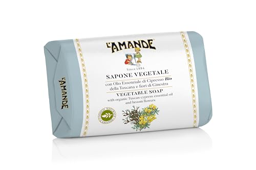L'AMANDE - Vegetabilisk Handtvål Delikat Känslig Hud med Eterisk Olja Toskansk Ekologisk Cypress, Energizing Cleaning Tvål Utan Gratis Alkalier, Blommande Arom och Delikat 200gr