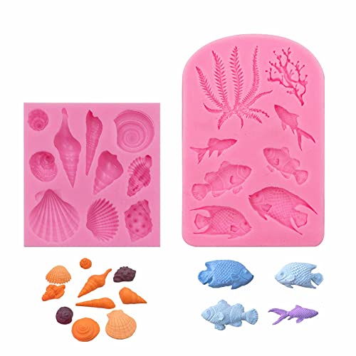 Duozea Havsmotiv fondant silikon formar tvålform - 3D ocean djur dekoration med mussla korall fisk lämplig för kex sötsaker choklad tårta tvålar epoxihartser, 2 stycken, 15 x 10 x 4 cm