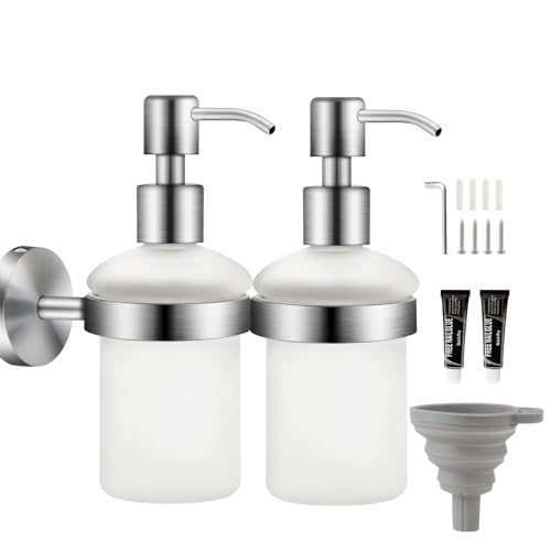 EXLECO 2 stycken tvåldispenser väggmonterad tvålpump set borrning & självhäftande rostfritt stål 304 200 ml förkromad satin glasflaska hand desinfektionslåda utan borrning för schampo duschgel