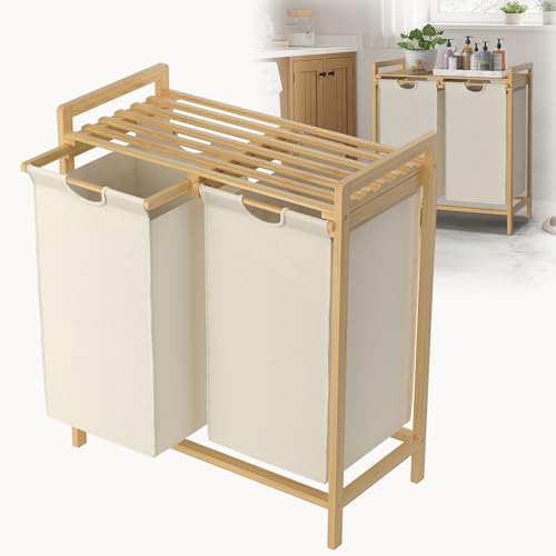 HENGMEI Tvättkorg, 2 fack, bambu, tvättsorterare med hylla, tvättkorg, avtagbara tvättpåsar, tvättlöpning för sovrum, tvättstuga (beige)