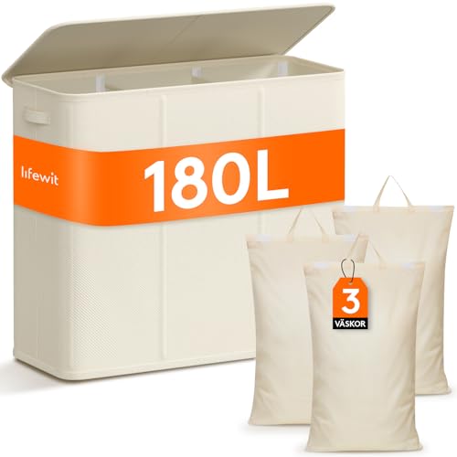 Lifewit 180 liters tvättkorg med 3 sektioner, extra stor tvättkorg med lock, korg med handtag för smutstvätt, uppdelad tvättsorterare med 3 löstagbara tvättpåsar, Vit