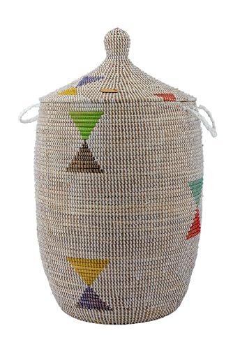 YAADU XL tvättkorg med lock 50 l – flätad tvättkorg, afrikansk korg, tvättkorg med lock, förvaringskorg för leksaker och filtar, korg med handtag, modell Shaka (vitfärgad triangel)