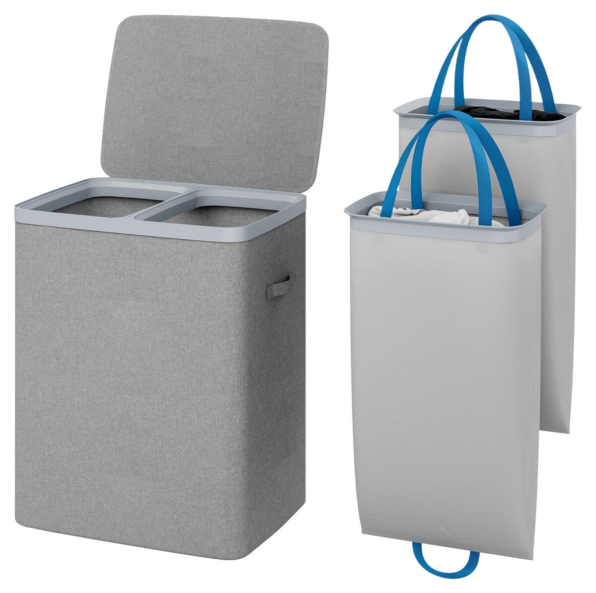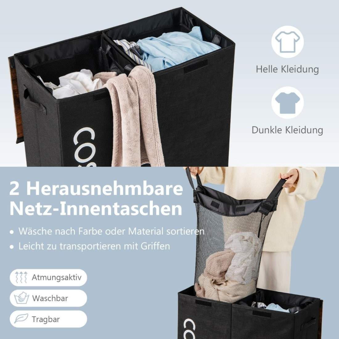 Tvättkorg med lock – 105L, dubbla fack, svart