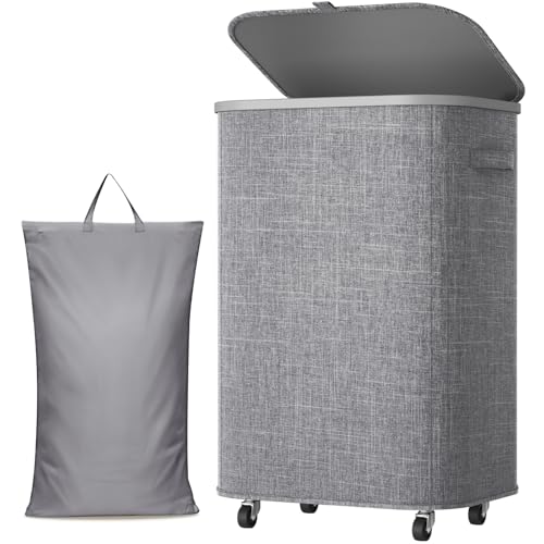 efluky Tvättkorg med hjul 100 l, XL tvättkorg med lock med avtagbar och tvättbar innerficka, grå tvättkorg extra stor bambu för tvättstuga, sovrum, badrum