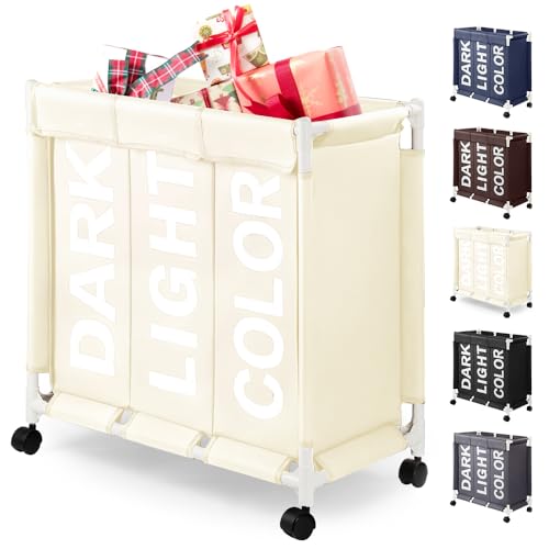 Rieeyrslza Tvättsorterare på Hjul 90L Tvättkorgar 3 Fack Oxfordtyg Tvättkorg Med Lock Flyttbar Tvättkorg Med Hjul Effektiv Sortering och Förvaring(Beige o2)