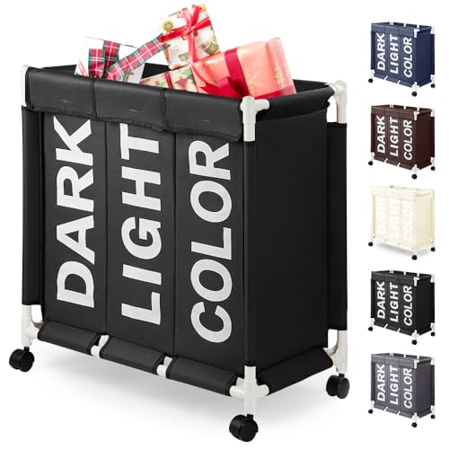 Lifewit tvättkorg med hjul, 120 liter 3 sektioner utdragbara tvättkorgar med stor övre hylla och 3 avtagbara säckar & handtag, klädsortering för tvättstuga sovrum badrum och studentrum, Svart