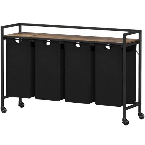Lifewit tvättkorg med hjul, 168 liter 4 sektioner utdragbara tvättkorgar med stor övre hylla och 4 avtagbara säckar & handtag, klädsortering för tvättstuga sovrum badrum, Rustik brun och svart
