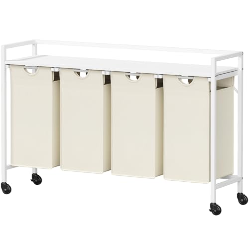 Lifewit tvättkorg med hjul, 168 liter 4 sektioner utdragbara tvättkorgar med stor övre hylla och 4 avtagbara säckar & handtag, klädsortering för tvättstuga sovrum badrum, Vit
