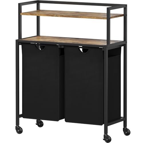 Lifewit Tvättkorg 3 Sektion, Stor Rullande Tvättsortering med Hylla & 2 Lådor, Utdragbar Tvättkorg Organisatör med hjul och avtagbar väska för Tvättrum Badrum, Rustikt brunt och svart