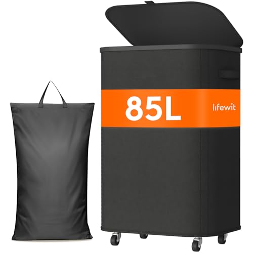 Lifewit Tvättkorg med lock på hjul, 85 l tvättkorg med plastram, vikbar stor tvättsorterare, tvättlåda, tvättkorgar för sovrum, badrum, svart