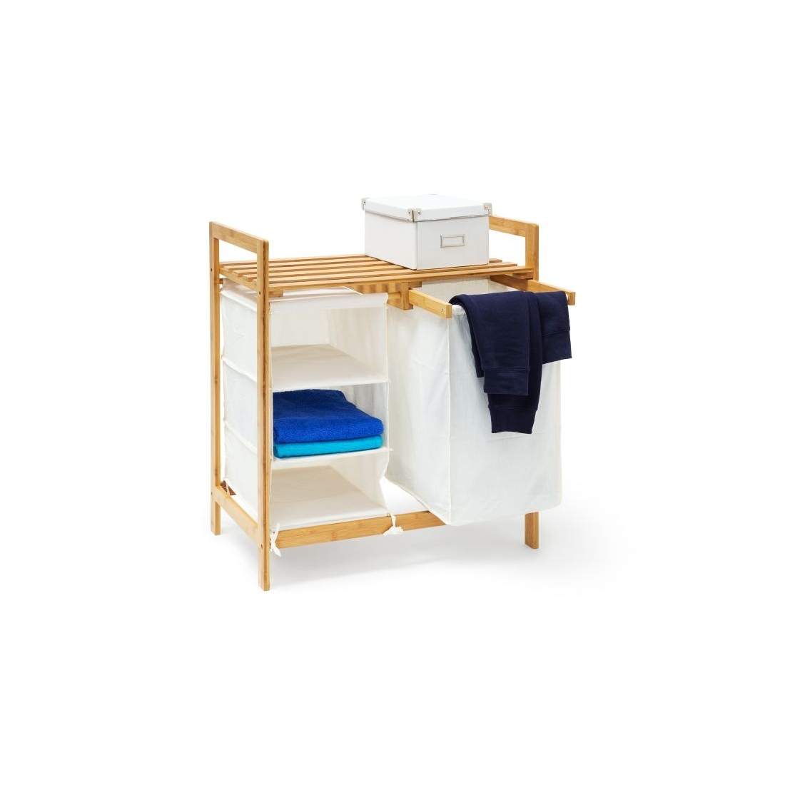Relaxdays bambu Linea tvättkorg och hylla med 3 fack tvättkorg linnefack med tvättpåse 40 L med vitt tyg 77 x 69,5 x 36 cm, naturlig färg