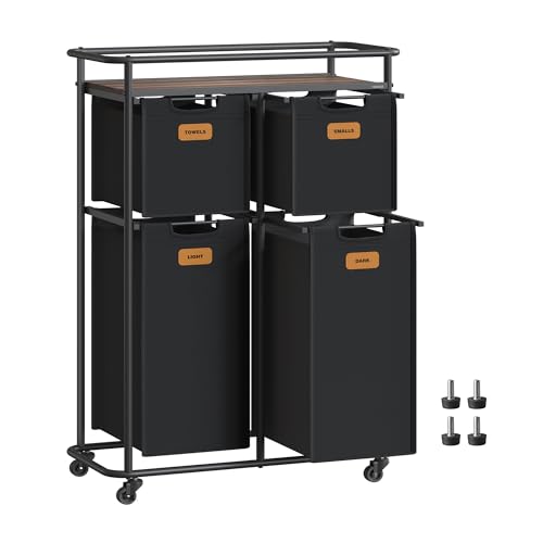 Vasagle Tvättsorterare RLS100B01, tvättkorg med hjul, 150 l rullande tvättkorg, bärbar tvättvagn med hylla, 4 urtagbara foder och 6 etiketter, bläcksvart och kastanjebrun