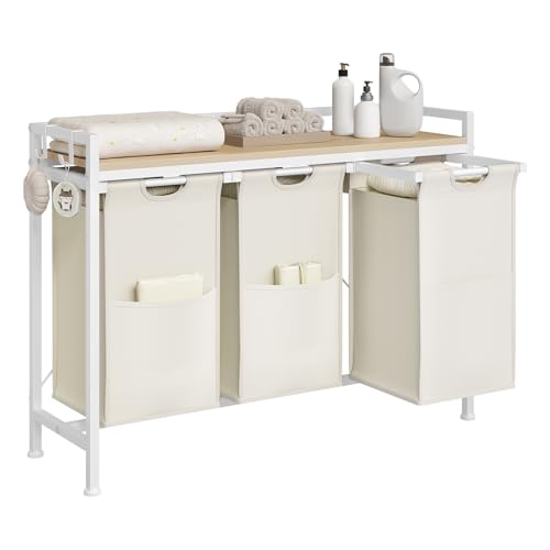 LAATOOREE Tvättkorg, tvåfärgad tvättkorg i 3 delar med 3 avtagbara tvättsorteringsväskor och övre hylla, klädkorg för tvättstuga, badrum