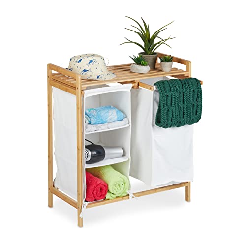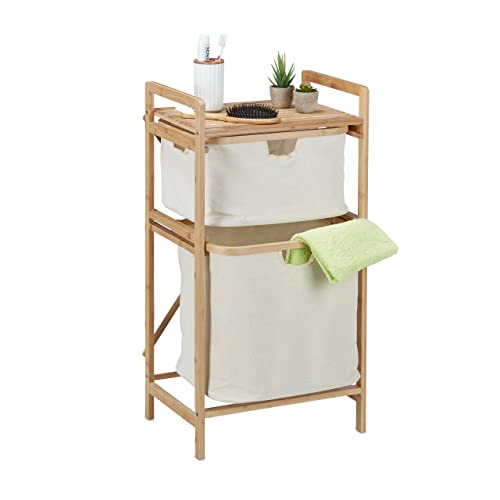 Relaxdays Tvättkorg hylla, bambu, tvättsorterare 2 fack, HBT: 85 x 44 x 33 cm, badrumshylla med tvättkorg, natur/beige