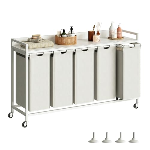 Herture Tvättkorg med hylla, tvättkorg i 5 sektioner, tvättsorterare med utdragbara avtagbara stora påsar och hjul, metallram, 5 x 60 l, vit PF08XLW