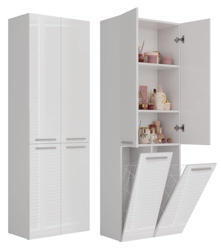 ADGO badrumsskåp med 2 tvättkorgar, högt badrumsskåp, högskåp, hylla, inbyggd tvättkorg, tvättpåse, fristående (vit högglans/fram)