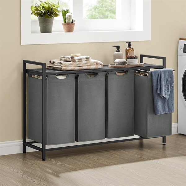 Tvättkorg med 4 utdragbara fack och hylla i trä – Svart/Grå