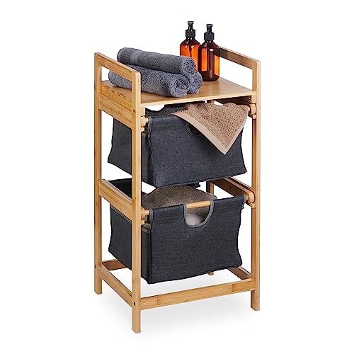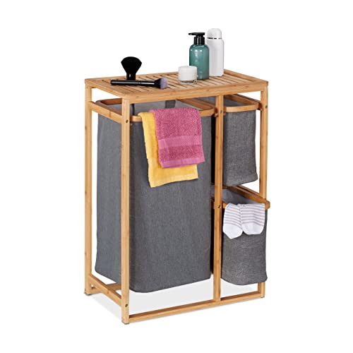 Relaxdays Tvättkorg hylla, bambu, tvätthylla 3 fack, HBT: 70 x 50 x 30,5 cm, badrumshylla med tvättkorg, natur/grå