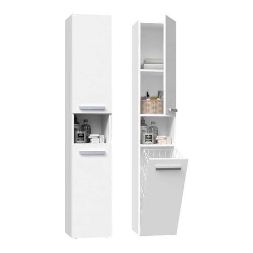 ADGO badrumsskåp med tvättkorg – högskåp – vit hylla – badrumsmöbler – badrumshylla – förvaringsskåp – badrum högskåp – badrumsskåp högt – universalskåp.
