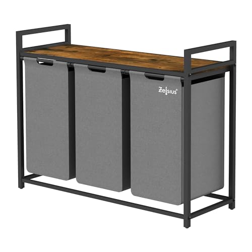 Zelsius Tvättkorg 3 fack | grå, 92,5 x 33 x 72 cm | tvättkorg med hylla, smutstvättbehållare med tvättpåse | tvättsorterare, tvättlåda, tvättpåse | tvättsystem, tvättkorg