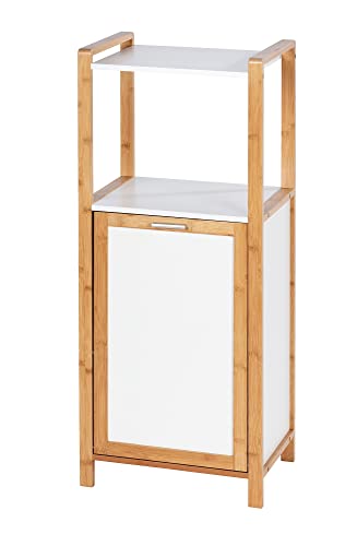 WENKO Regal Finja med 2 hyllor och integrerad tvättkorg, badrumsskåp av naturlig bambu och MDF med tvättkorg i grått, hög hylla för hela hushållet, 40 x 95 x 30 cm, vit/natur