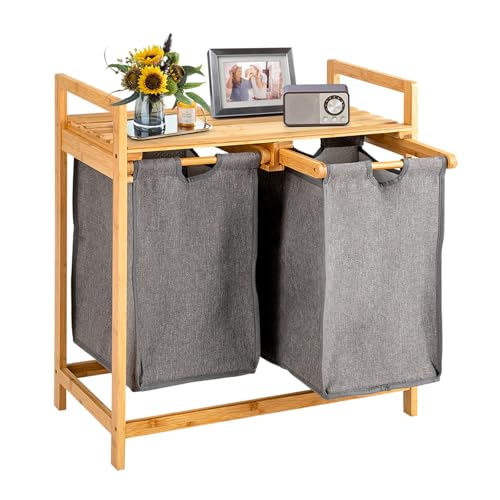 COSTWAY Tvättkorg 2 fack, tvättsorterare bambu, med hylla, utdragbar tvättkorg, för badrum, vardagsrum och sovrum