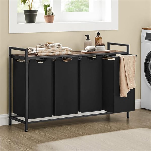 Tvättkorg med 4 utdragbara fack och hylla i trä – Svart