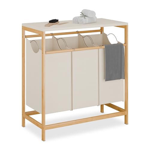 Relaxdays tvättkorg med 3 utdragbara tvättkorgar, vikbar hylla, HBT: 84,5 x 78,5 x 40 cm, bambu, natur/kräm