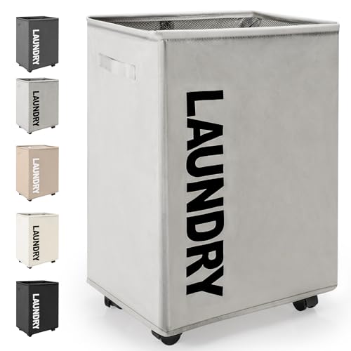 Rieeyrslza Hopfällbara Tvättkorgar med Hjul 65L Stor Hopfällbar Tvättkorg Rektangulär Vattentät Tvättbehållare Hopfällbara Tvättkorgar med Hjul Praktisk Tvättsamlare (Ljusgrå)
