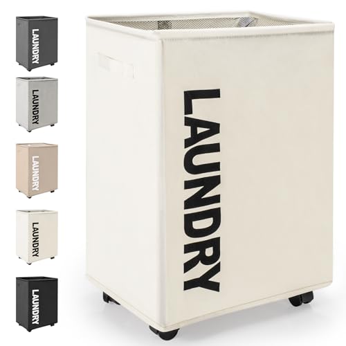 Rieeyrslza Hopfällbara Tvättkorgar med Hjul 65L Stor Hopfällbar Tvättkorg Rektangulär Vattentät Tvättbehållare Hopfällbara Tvättkorgar med Hjul Praktisk Tvättsamlare (Beige)