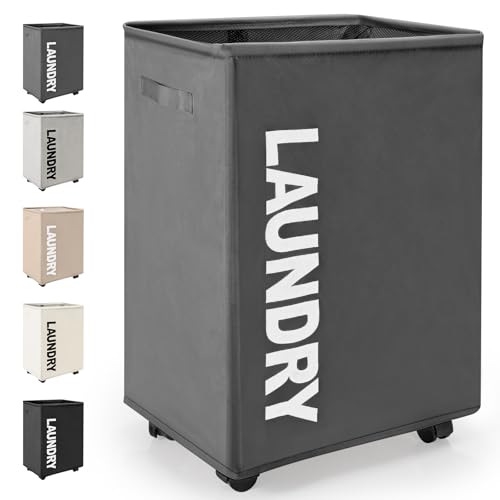 Rieeyrslza Hopfällbara Tvättkorgar med Hjul 65L Stor Hopfällbar Tvättkorg Rektangulär Vattentät Tvättbehållare Hopfällbara Tvättkorgar med Hjul Praktisk Tvättsamlare (Mörkgrå)