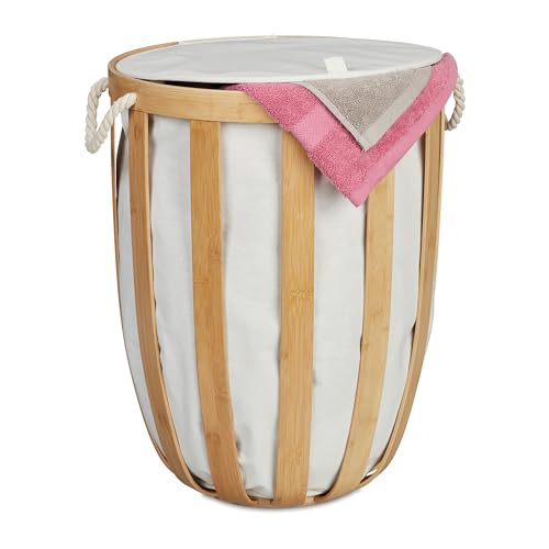 Relaxdays tvättkorg med lock, tvättförvaring, förvaringskorg i bambu, tvättsäck, hopfällbar, rund ca 40 cm, natur