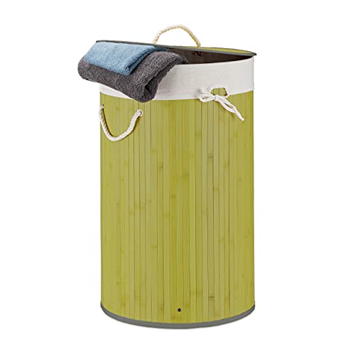 Relaxdays Bambu tvättkorg, vikbar tvättkorg med lock, volym 70 liter, tvättpåse bomull, rund Ø 41 cm, grön