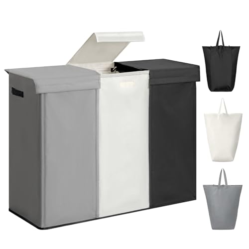 WOWLIVE 230 l tvättkorg 3 fack med lock, stor, hopfällbar, avtagbara tvättpåsar, 3 skiljeväggar, handtag för sovrum, tvättstuga, skåp