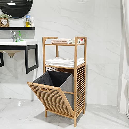 COSTWAY 2 i 1 badrumshylla och tvättkorg, högskåp för badrum av bambu med 3 hyllor, tvättskåp med avtagbar tvättpåse och handtag, badrumshylla för badrum sovrum tvättstuga, natur