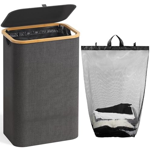 Bambu Tvättkorg Smal med Lock 70 L Tvättkorg med Handtag, Avtagbar Tvättväska, Tvättkorgar för Tvättstuga Sovrum Badrum Grå Aoso