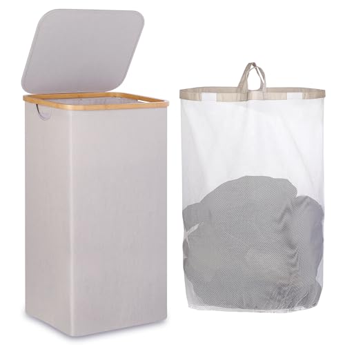 iEGrow Tvättkorg 110 l, tvättkorg med lock och handtag, hopfällbara tvättkorgar med avtagbar innerväska, bambu tvättkorg för sovrum badrum tvättstuga (ljusgrå)