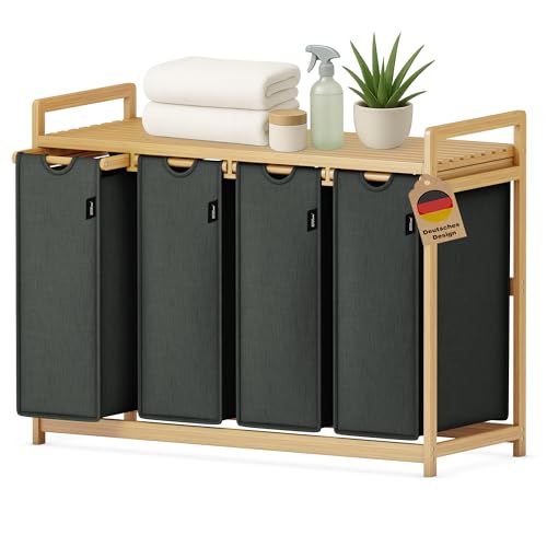 XMHome 198 l tvättkorg, 4 fack med ett lager hylla – robust bambumaterial, tjock struktur, modern tvättkorg för badrum, sovrum och tvättstuga tvättkorg mörkgrå