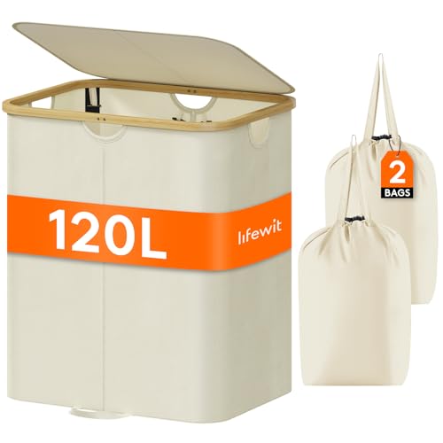 Lifewit 120 liter tvättkorg med lock, klädkorgar för tvätt med bambuhandtag och en avtagbar tvättpåse, stor hopfällbar tvättkorg för sovrum, badrum, studenthem, tvättstuga, Beige