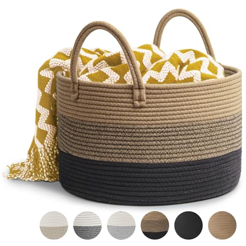 Fiona's magic Stor vävd tvättkorg på 58 l, hög tvättkorg i bomullsrep, boho-förvaringskorg för filtar, leksaker och kläder, korgar för sovrum och vardagsrum, brun och svart