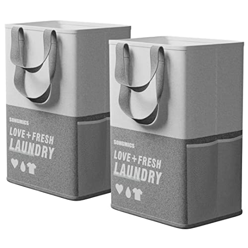 SONGMICS Stora tvättkorgar, 90 l, set med 2, tvättkorg med 2 fack, fristående vikbar, dubbla handtag, för tvätt sovrum badrum, ljusgrå LCB209G12, 40 x 35 x 65 cm