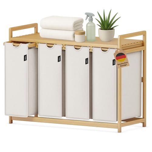 XMHome 198 l tvättkorg 4 fack med ett lager hylla – robust bambumaterial, tjock struktur, modern tvättkorg för badrum, sovrum och tvättstuga tvättkorg 102,8 x 41,3 x 77,5 cm grå