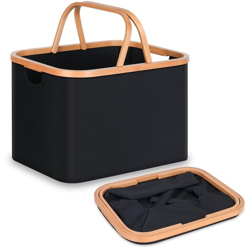 efluky Vikbar tvättkorg 43 l, bambutyg, vikbar förvaringskorg, vikbar tvättkorg, tvättkorgar för sovrum badrum (svart, fällbart handtag)