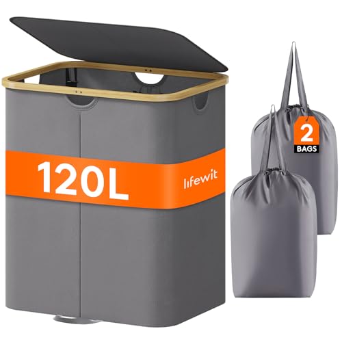 Lifewit 120 liter tvättkorg med lock, klädkorgar för tvätt med bambuhandtag och en avtagbar tvättpåse, stor hopfällbar tvättkorg för sovrum, badrum, studenthem, tvättstuga, Grå