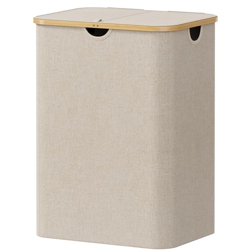 Lifewit 100 L tvättkorg med lock, klädkorgar för tvätt med bambuhandtag och en avtagbar tvättväska, stor hopfällbar tvättkorg för sovrum, badrum, sovsal, tvättstuga, beige